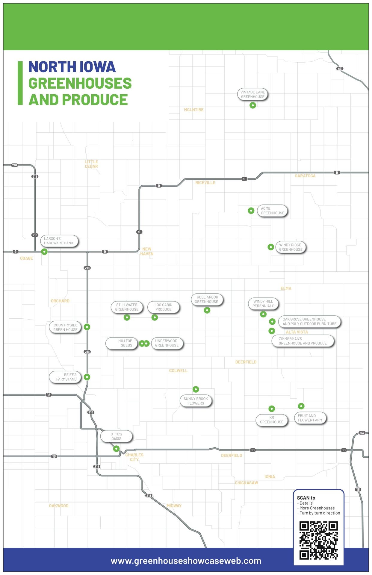 The complete listing will include every greenhouse and produce location across Northeast-central Iowa, including Floyd, Charles City, Colwell, Deerfield, Ionia, New Hampton, Alta Vista, Elma, Riceville, Osage, and Orchard.